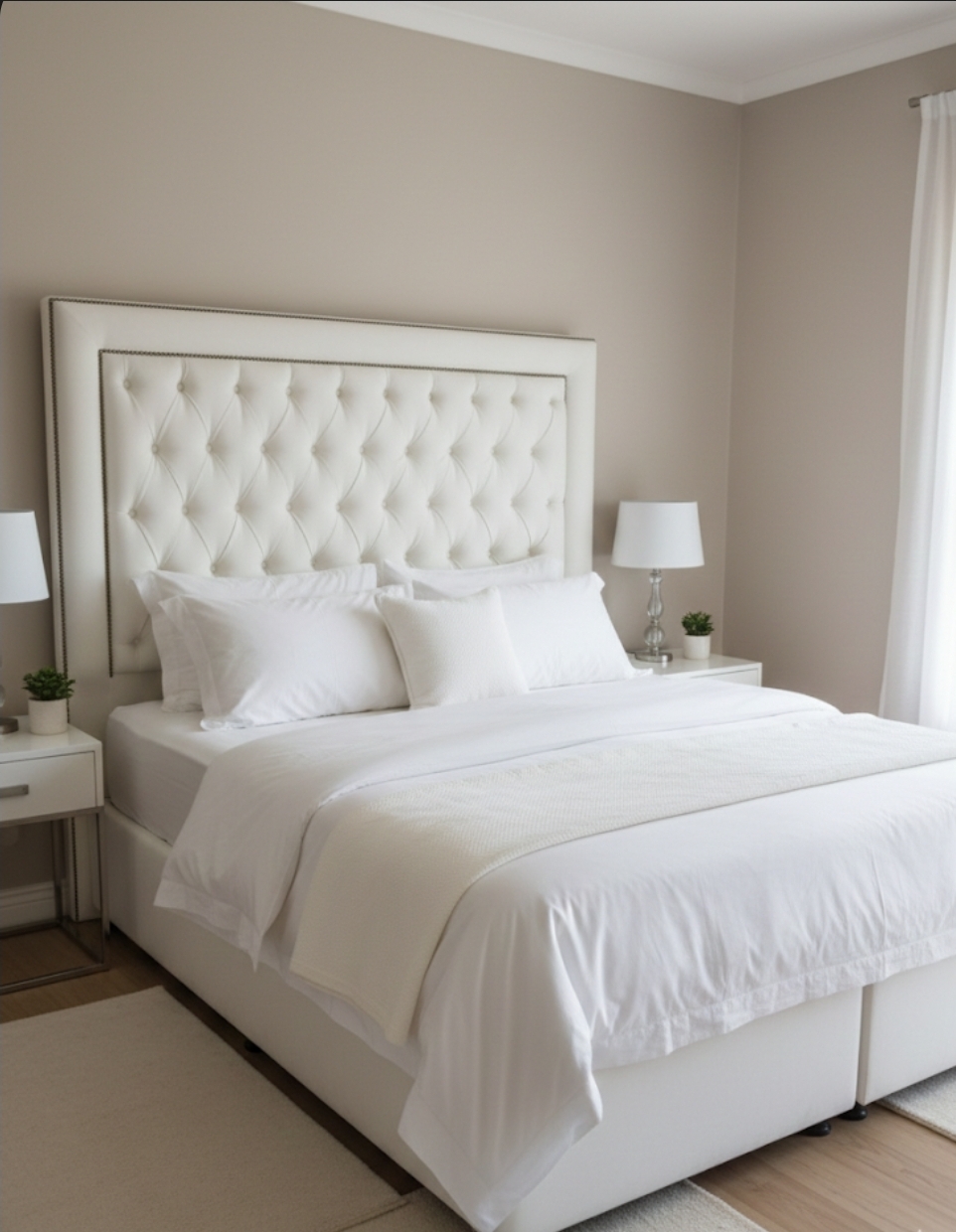 Deep buttoned queen size headboard with rolled border . Stud detailing on the outside of the headboard and on the edge of the deep buttoned centre panel, gives this headboard a unique and luxurious finish. This headboard is available now to purchase and can be ordered in any size or fabric to suite your bedroom. There is a 4 to 6 week lead time on custom orders.