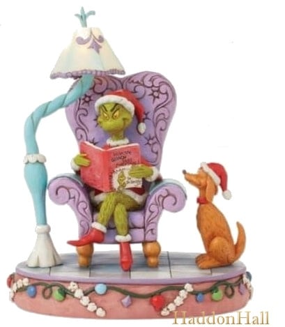 This Jim Shore creation features The Grinch reading in a large rosemale blue & purple chair. With a light-up lamp, Grinch reads his Dr Seuss book dressed as Santa. His loyal dog, Max, sits by his side. Enjoy Christmas with this classic character.