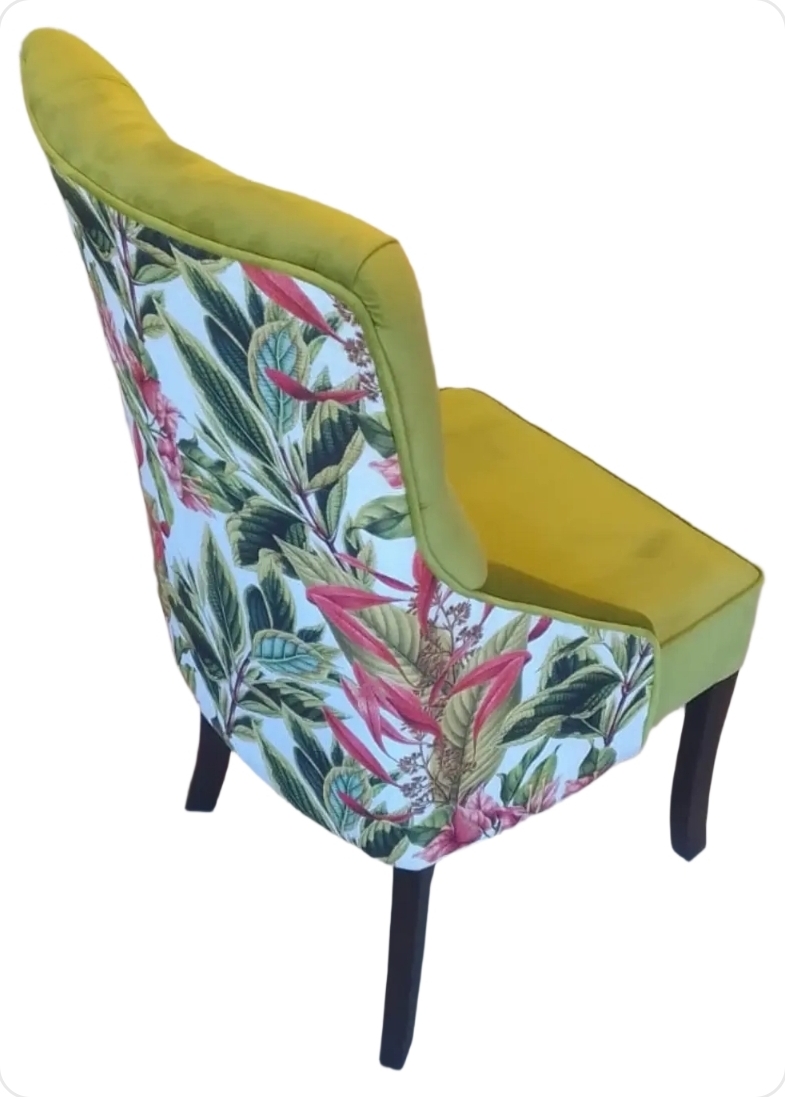 Two tone comfy dining chairs by Cherylin Creations. Loomcraft bougainvillea dn Hertex velvet makeup these beautiful statement pieces.