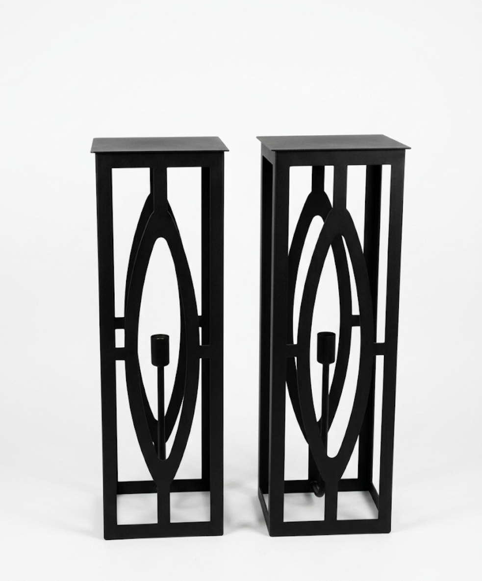 These lanterns are striking examples of architectural metalwork, blending geometric precision with an airy, open-frame design. Their elongated rectangular silhouette provides a strong vertical presence, while the laser-cut detailing adds a sophisticated artistic touch.